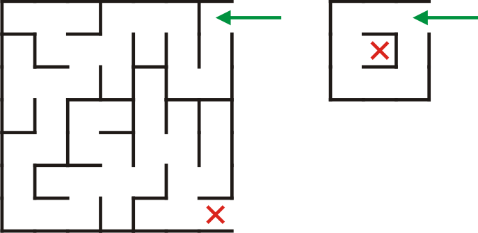Some algorithms will not work under certain circumstances. For example, one rule for getting through a maze is to always follow the left-hand wall. Figure 4 shows two mazes where the object is to get from the start (a green arrow) to the end (a red 'x').