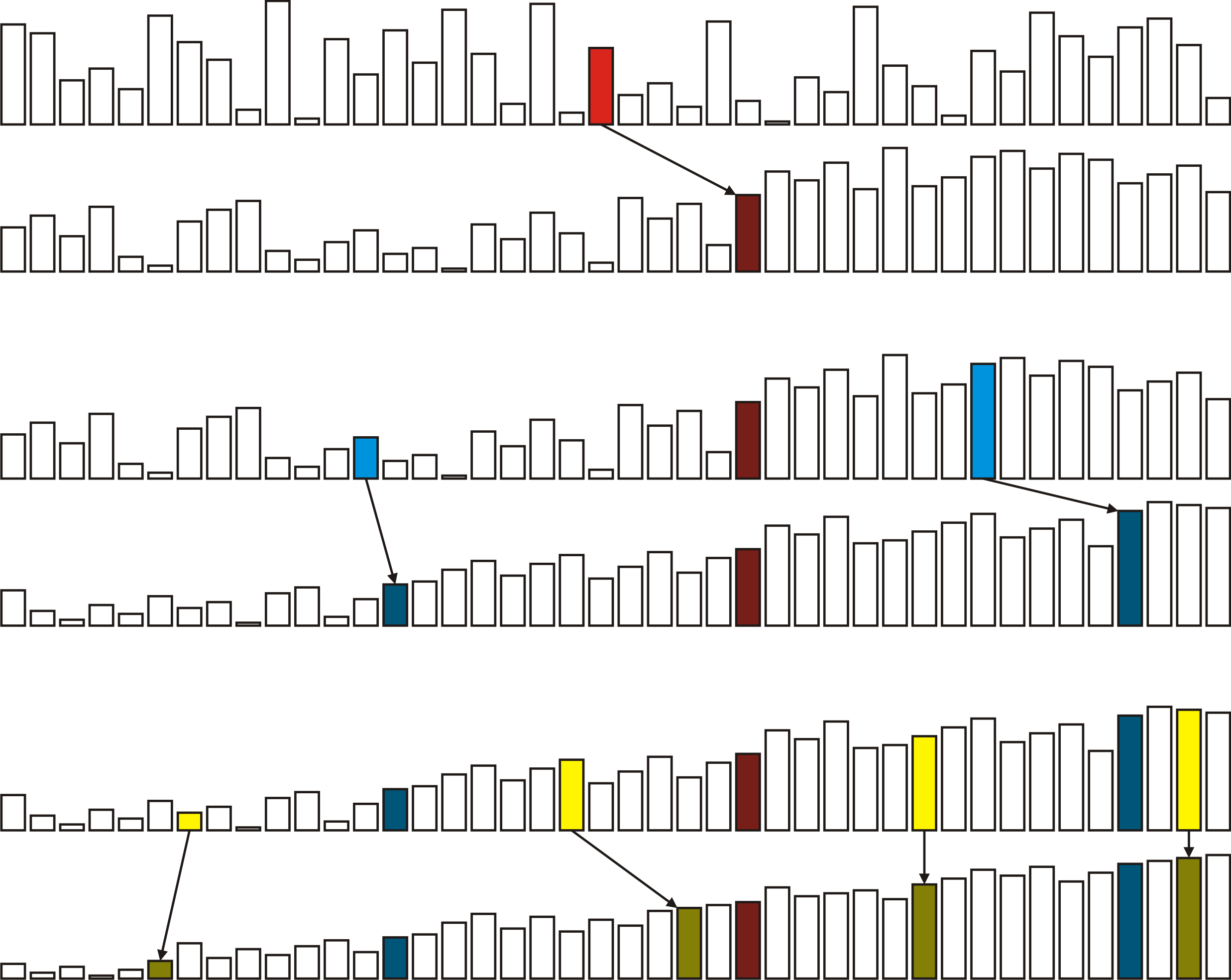 This is an algorithm called quicksort. If you look the list, it already looks significantly closer to be sorted from smallest to largest than that shown in Figure 2; even though getting to the third step required approximately the same amount of work.