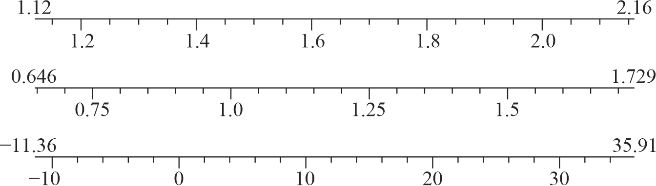 Now, it is reasonably straight-forward for a human to look at an axis and determine appropriate major and minor tick marks. For example, if asked to create major and minor tick marks for the interval $[1.12, 2.16]$, $[0.646, 1.729]$ and $[-11.36, 35.91]$, one may come up with the following solutions: