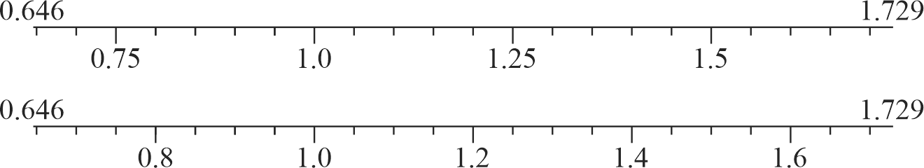 Note, there is no perfect solution; however, some criteria that may be used to compare and contrast different solutions include that the numeric values of the tick marks should not have repeating decimal expansions and the fewer significant digits that appear in the numeric values associated with the tick marks, the better. For example, in the example above, a second solution for tick marks on the interval $[0.646, 1.729]$ could be found: