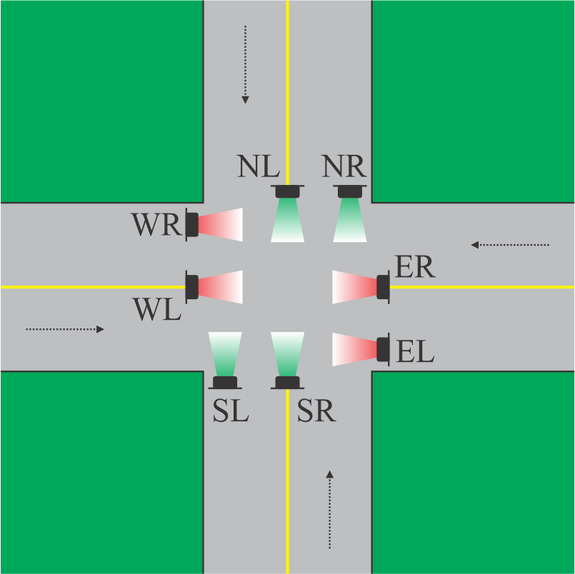 We will look at a number of problems with respect to traffic light analysis. We will assume we are at an intersection with four pairs of lights, labelled North, South, East and West; and Left and Right, as shown in Figure 1.