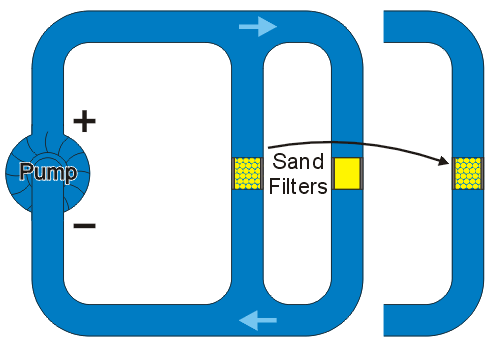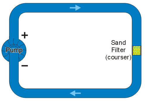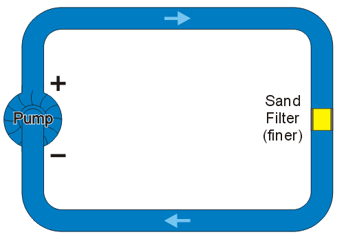 The sand filter is providing a resistance to the circling water. The amount of resistance depends on the properties of the sand. If the sand is replaced with a courser sand, as is shown in Figure 2, there will a corresponding lower resistance as there are larger gaps between the sand particles and consequently, the water will be able to more easily pass through the filter. It will, therefore, be easier for the pump to circulate the water and the current (speed of circulation) will be faster.
