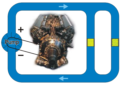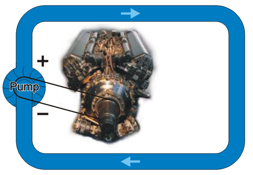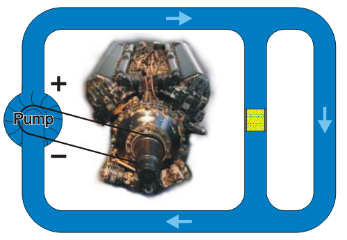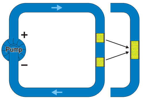 In Figures 0-7, the pump is hooked up to a small motor. Suppose, however, that you have a very large engine (the engine of a Spitfire, for example) which has a controlled speed. This motor produces a constant current flowing through the pipe regardless of the obstacles. If there is are no filters in the pipe, the water travels a a given speed and when a filter is placed into the pipe, the current remains unchanged, but a stronger force is pushing the water through the filter.