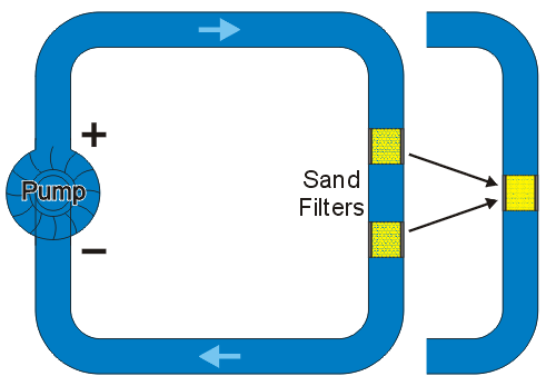 Consider a split in the pipes where both pipes are equal in size. In this case, one would expect an equal amount of flow in each pipe; however, if there is a sand filter in one of the two pipes as is shown in Figure 9, then the pressure from above and below that filter will be equal. Consequently, all the water will flow through the pipe without a sand filter.