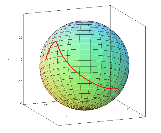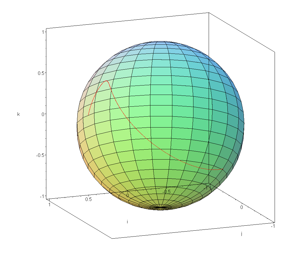 Figure 1. A spherical Bezier curve between q0 = 0.6i + 0.8j and q3 = −0.8i − 0.6k with two control points.