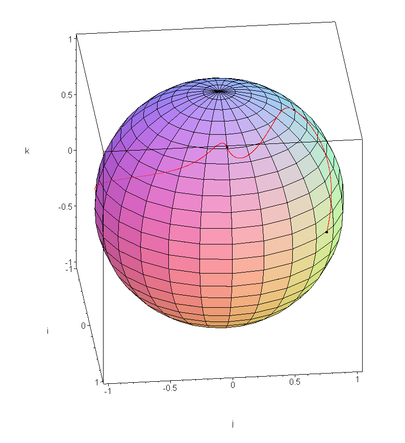 Figure 1. A spherical Spline connecting the points q0 = 0.6i + 0.8j, q1 = 0.6j + 0.8k, q2 = 0.6i + 0.8k, q3 = −0.8i − 0.6k.