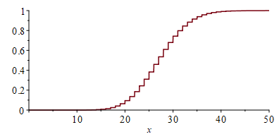 [> plot( CDF( X3f, x ), x = 0..50, 'discont' = true );