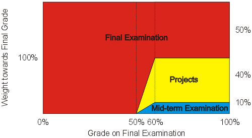 Each of these is further sub-divided as to when projects/laboratories begin having non-zero weight (either 40 or 50) and when projects/laboratories have full weight (either 50 or 60). In each case, the formula below the images gives the result for the transition zone.