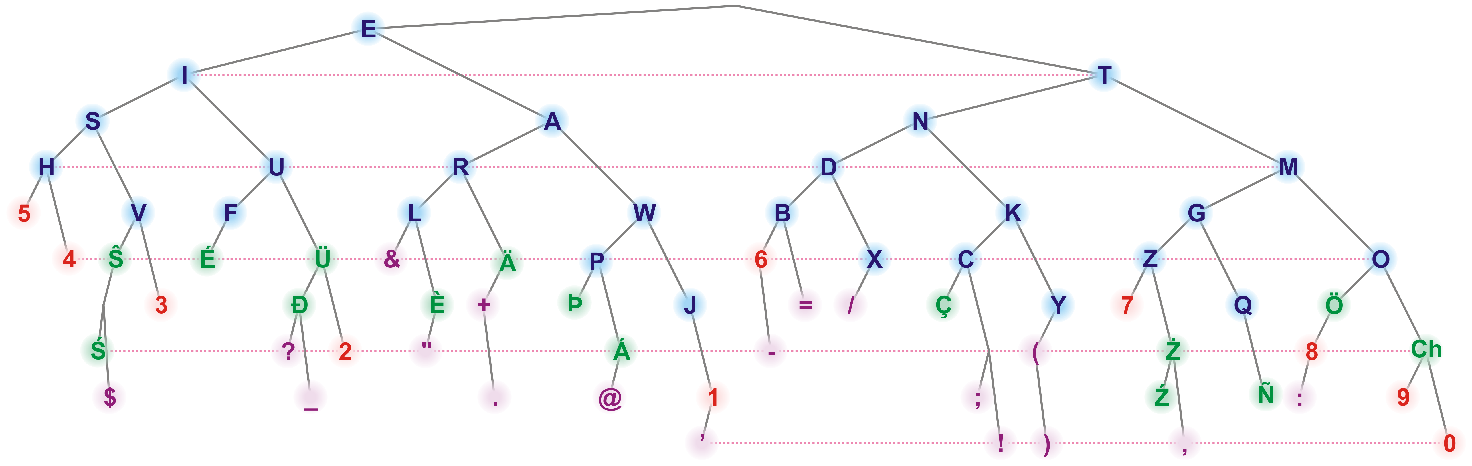 This is a nice graphic I came up with that shows the density of Morse code in Figure 2. The left sub-tree is followed for a dot, while the right sub-tree is followed for a dash. The depth approximates how long it should take to send a particular character—consequently, the right-hand sub-trees are deeper than the left-hand sub-trees. Characters that take the same amount of time to send are at the same depth in the tree relative to the root.
