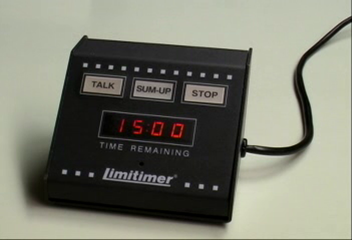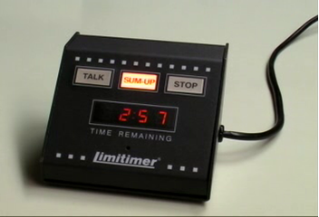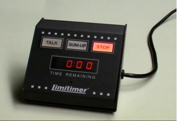 There are three lights following the same scheme as the traffic-light aid. When the timer is started, the green light ("TALK") is lit. After twelve minutes have passed three minutes remaining, the yellow light ("SUM UP") is lit, and after fifteen minutes, the red light ("STOP") is lit. These are shown in Figure 2, 3, and 4.