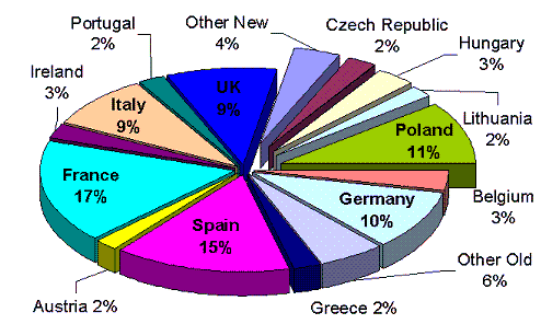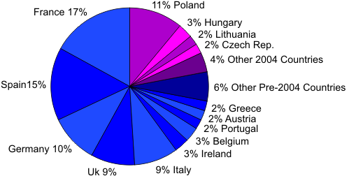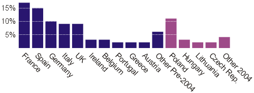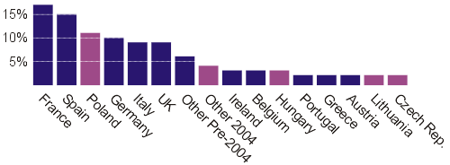 Figure 19 shows a more standard pie chart. There are too many countries to give each country a separate colour; consequently, as the focus appears to be comparing older EU countries versus newer EU countries, shades of blue are used for the former while shades of violet are used for the latter. Green was not used as it represents soil fertility and to use green on one side would suggest the other side is less fertile. Red was not used to avoid any negative reference to any former Soviet-block status. Colours are alternated and the order of the countries goes from largest percentage to smallest starting at 12 o'clock. The "others" are collected together at the end and are given a deeper colour. The use of words such as "old" and "new" is inappropriate; as Romania is not listed, this would suggest that the graph compares pre-2004 entrants and 2004 entrants into the EU.