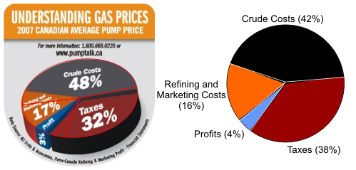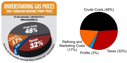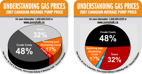 We will now look at two examples of pie charts which have a large audience: the ubiquitous "Understanding Gas Prices" sticker found on all pumps at Petro-Canada stations and an example of a pie chart found on Wikipedia.