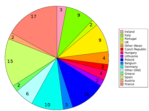 The alternate view, also uploaded to wikipedia, shown in Figure 20, suffers from similar problems; most notably the use of the similar colours which are not adjacent, e.g., Italy and Greece, and Spain and Portugal. This may even suggest that countries in the same region have similar shades; however, this is not the cases as the UK and Ireland are yellow and pink, respectively. The audience is left attempting to determine a pattern where no pattern exists. More odd is the nesting of the 2004 Countries in the middle of the menu between UK and Belgium. The choice of colours includes orange, red, rose, purple, and blue where Others (New) (orange) has a colour which associates it more with the UK slice (yellow) and Poland (blue) has a colour which associates it more with the Belgium slice (turquoise).