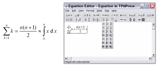 For more complex mathematical expressions, use the Microsoft Equation Editor: select Insert→Object... and from the list select Microsoft Equation 3.0. This puts you into a mathematics editor which allows you to create very complex expressions with relative ease. To give an example, Figure 3 demonstrates how the approximation of the sum by using an integral may be generated using Microsoft Equation 3.0.