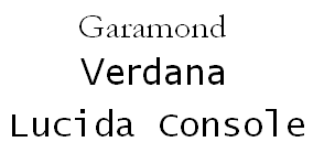 There are thousands of available typefaces, however, not all are installed on all computers. For a presentation to be portable, it must use standard fonts. Some alternative fonts are shown in Figure 10, one from each of the three appropriate categories while Figure 11 shows some common but undesirable fonts. It has been suggested by some that Lucida Console is more appropriate for displaying code, however, this is all a matter of personal taste.