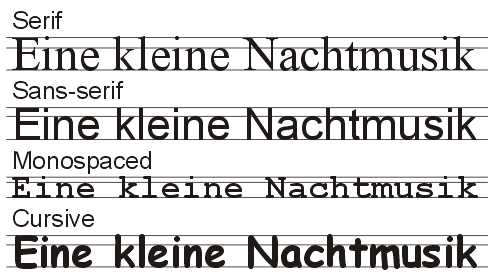 A cursive font is one which appears or attempts to appear to be hand written. The last category, monospace is more of a specialization: a monospaced font gives each glyph (a character, number, or punctuation mark) the width. Most monospaced typefaces are use serifs.