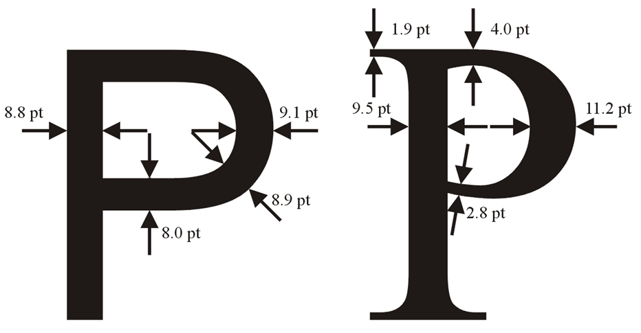 Figure 5. Comparing the structures of the character 'P' in both Arial and Times New Roman.