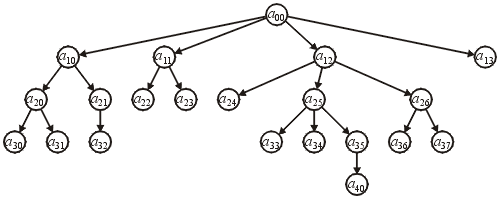 Figure 1 shows a hierarchical ordering of twenty-one objects. You may observe with the local definition, all nodes except the root $ a_{00} \le c $ have a parent. For example, the object $ a_{25} $ has $ a_{12} $ as its parent; however, with the mathematical definition, we may also say that $ a_{00} \le a_{25}$, $ a_{25} \le a_{34}$, $ a_{25} \le a_{35}$, and $ a_{25} \le a_{40}$.