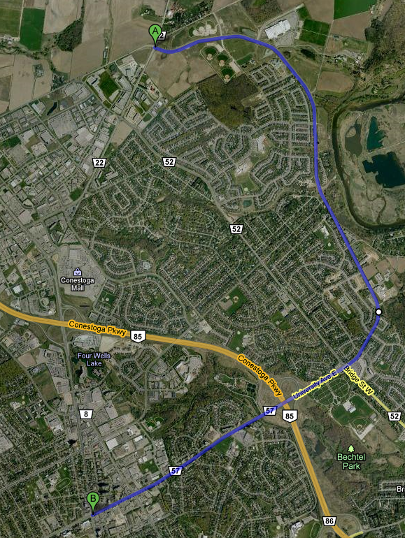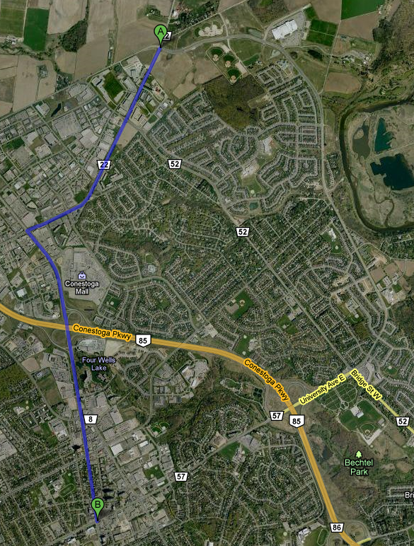 Figure 2. The longer direct route from University Ave. and Northfield Dr.