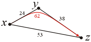 The last condition is referred to as the triangle inequality. In words, the triangle inequality says path directly connecting two points must be shorter than or equal to an out-of-the-way path visiting a third point. This is shown in Figure 1.