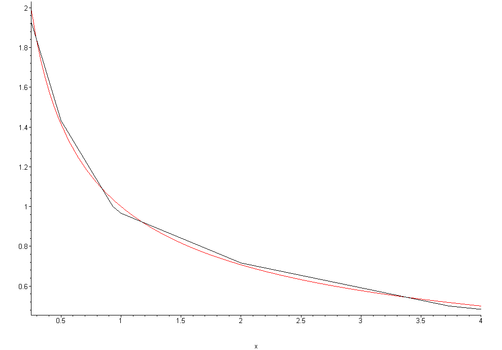 Figure 14. A plot of 1/√x and inv_sqrt_multiplier(x) on [0.25, 4].