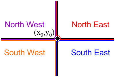 This quadtree node is used by the quadtree class to store pairs of elements. There are four sub-trees which are denoted as north-west, north-east, south-west, and south-east. In a binary search tree, all values less than the current element are stored in the left sub-tree while all values greater than the current element are stored in the right sub-tree. This is a generalization of that concept; however, now we are storing pairs of numbers and we must be more careful: