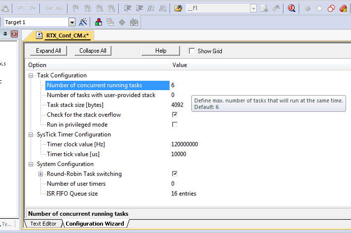 Figure 1. The configuration wizard for the file RTX_Conf_CM.c, accessible by selecting the Configuration Wizard tab