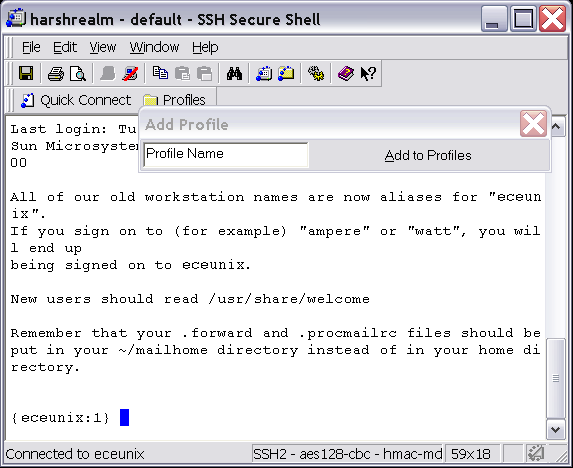 Once you have logged on, Ssh gives you the opportunity to give this host-name—login-name combination a profile name. Replace Profile Name with something like Harsh Realm and click Add to Profile. This allows you to connect to ecelinux with your login name by select it from the Profile drop-down box on the tool bar. This dialog is shown in Figure 3.