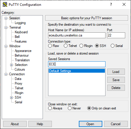 Now, the next time you launch PuTTY, you can just double click on the saved session, but for now, just select Open at the bottom of the screen. You will log on with your uWaterloo User ID and its associated password (these are the same you use to log onto Quest).