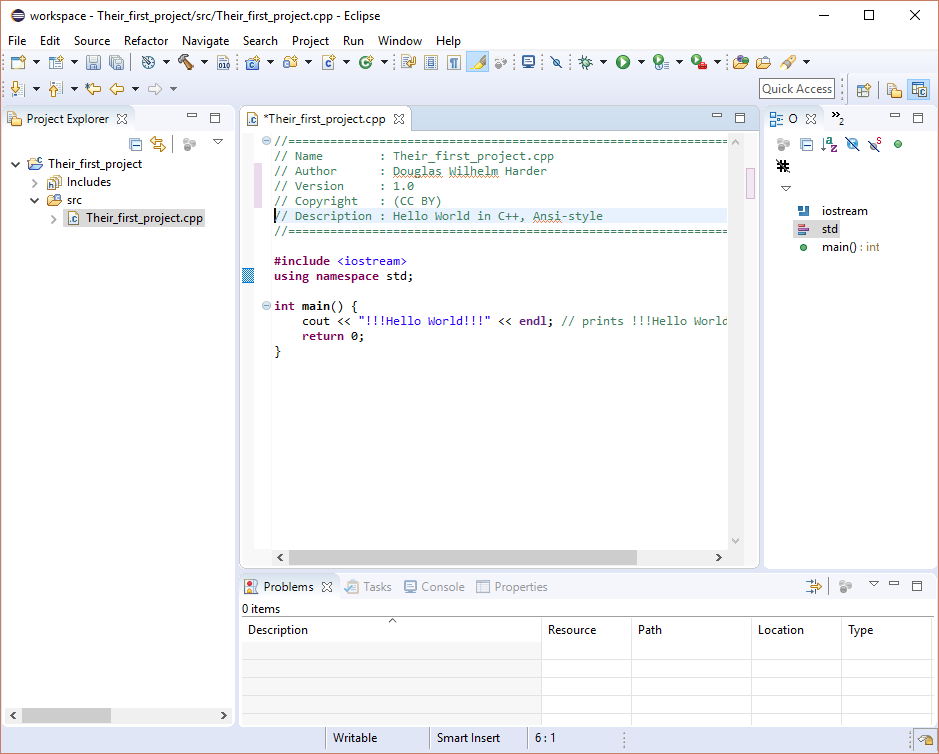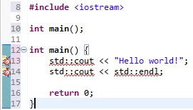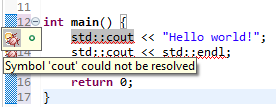Warning: If Eclipse seems to suggest that it does not recognize std::cout or std::endl, this may indicate a problem in finding the iostream header file. For example, the following image shows how Eclipse indicates this problem: