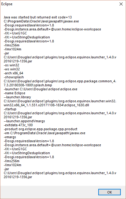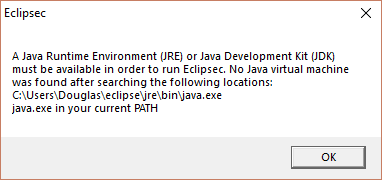 In Windows, if there is an issue with the installation of Java and you attempt to launch Eclipse, you may see one of the following two dialogs depending on whether you do not have Java installed, or you do not have the 64-bit version of Java installed, respectively: