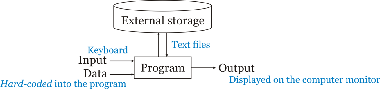 Alternatively, data can be stored in text files on some form of external storage, be that a hard-disk drive (HDD) or some form of solid-state drive (SSD). The program could either read data from or write data to files on those media.