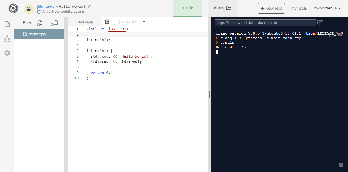 Now, you can either cut-and-paste this program into the editing panel of https://repl.it/ or load this program. Next, click Run▶ and the output will appear in the right panel where you will see the output Hello world!.