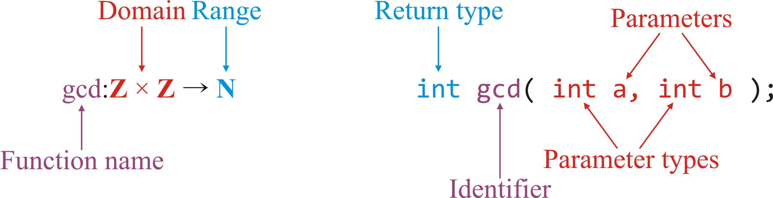 Here, the domain of the $\gcd$ function is Cartesian product ${\bf Z} \times {\bf Z}$ (that is, a pair of integers numbers) with the range being the natural numbers. In computer science, we say that the function identified by gcd takes two parameters of type int and has a return value of type int.