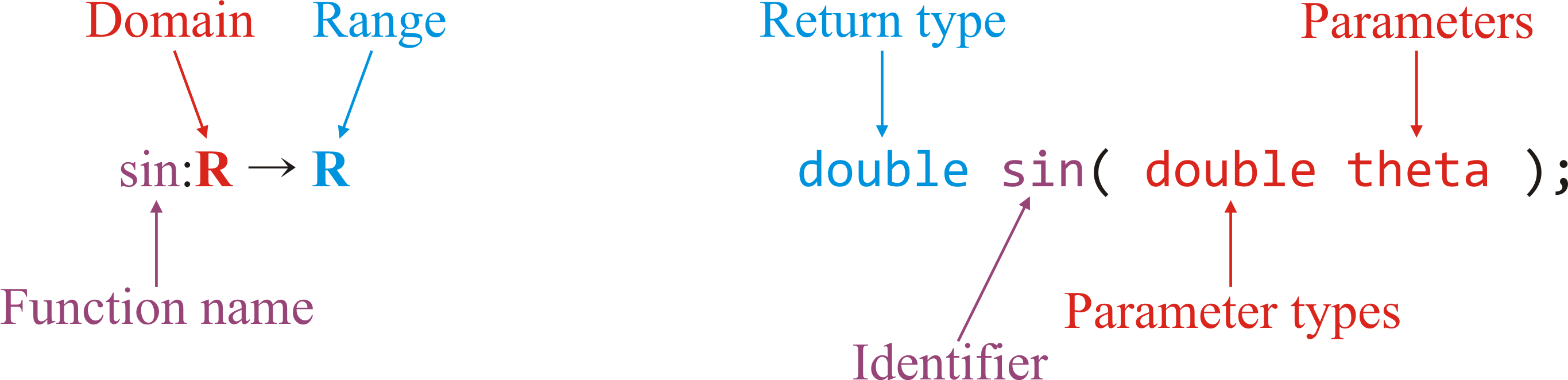 Here, the domain of the $\sin$ function is ${\bf R}$ with the range also being the real numbers ${\bf R}$. In computer science, we say that the function identified by sin takes one parameter of type double and has a return value also of type double.