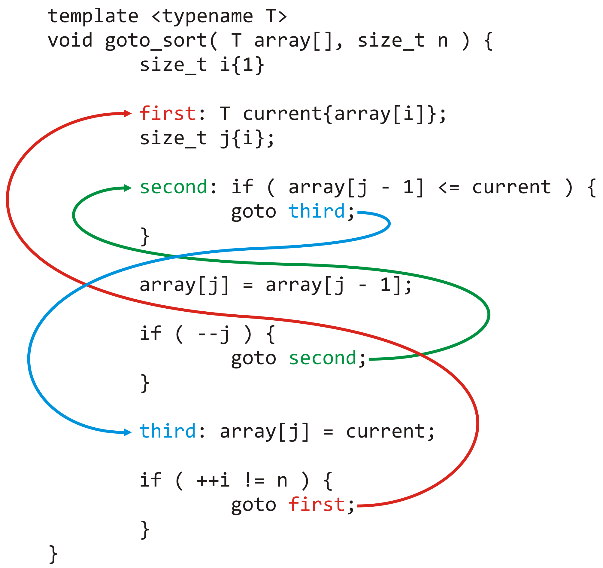 For example, the structured implementation of insertion sort, as we have seen it, uses a for-loop and a while-loop. This same program can be written with three goto statements: