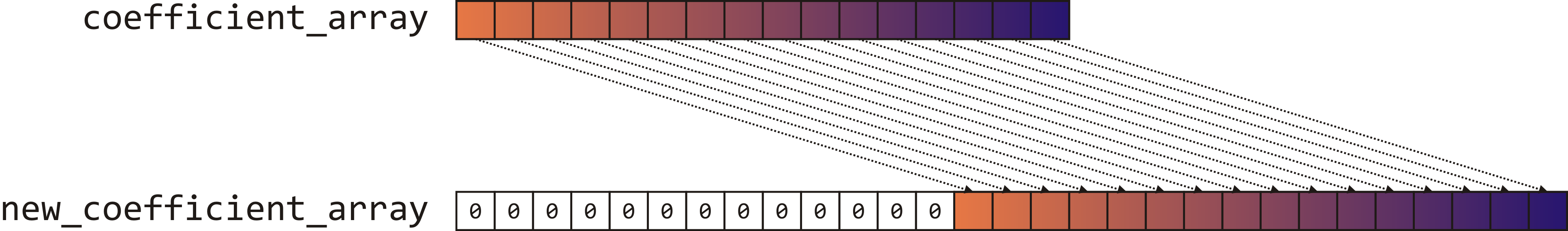 To get the coefficient from an array, we just have to do a little math: The last entry (array_capacity - 1)of the array is storing the coefficient of the term with degree zero; thus, the coefficient we are interested in is:
