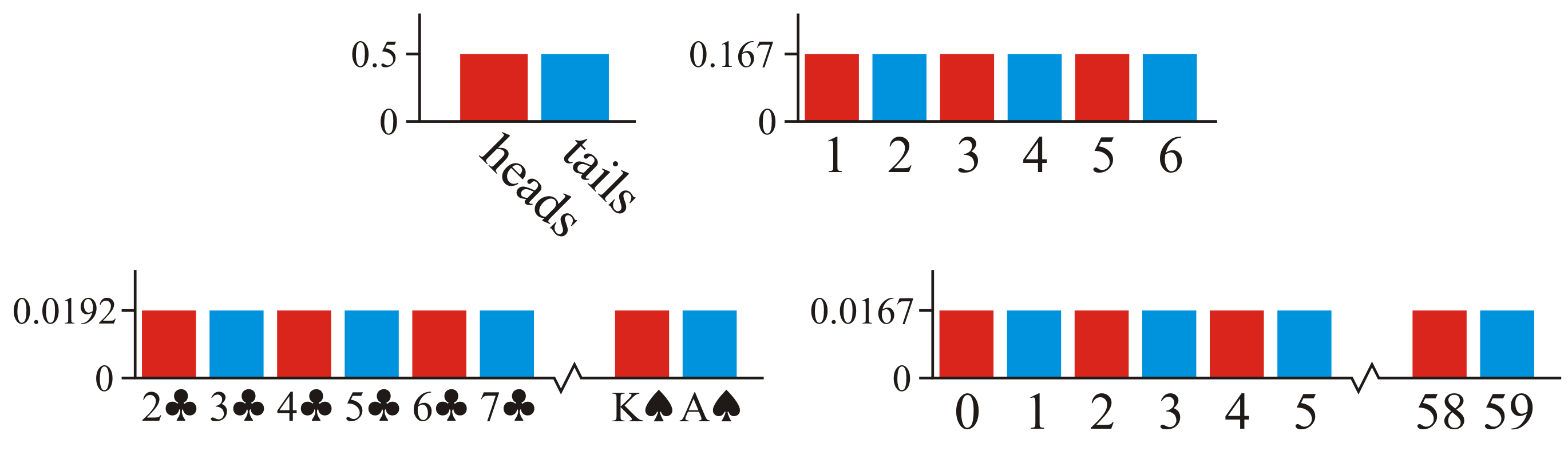 In each case, every event (the coin landing on heads, rolling a six, or choosing the jack of diamonds) has an equal chance, and because there are only a finite number of $n$ different possibilities, each event has a $\frac{1}{n}$ chance of appearing. You may have shown this using bar charts where the height of the bar is the probability of the event occuring:
