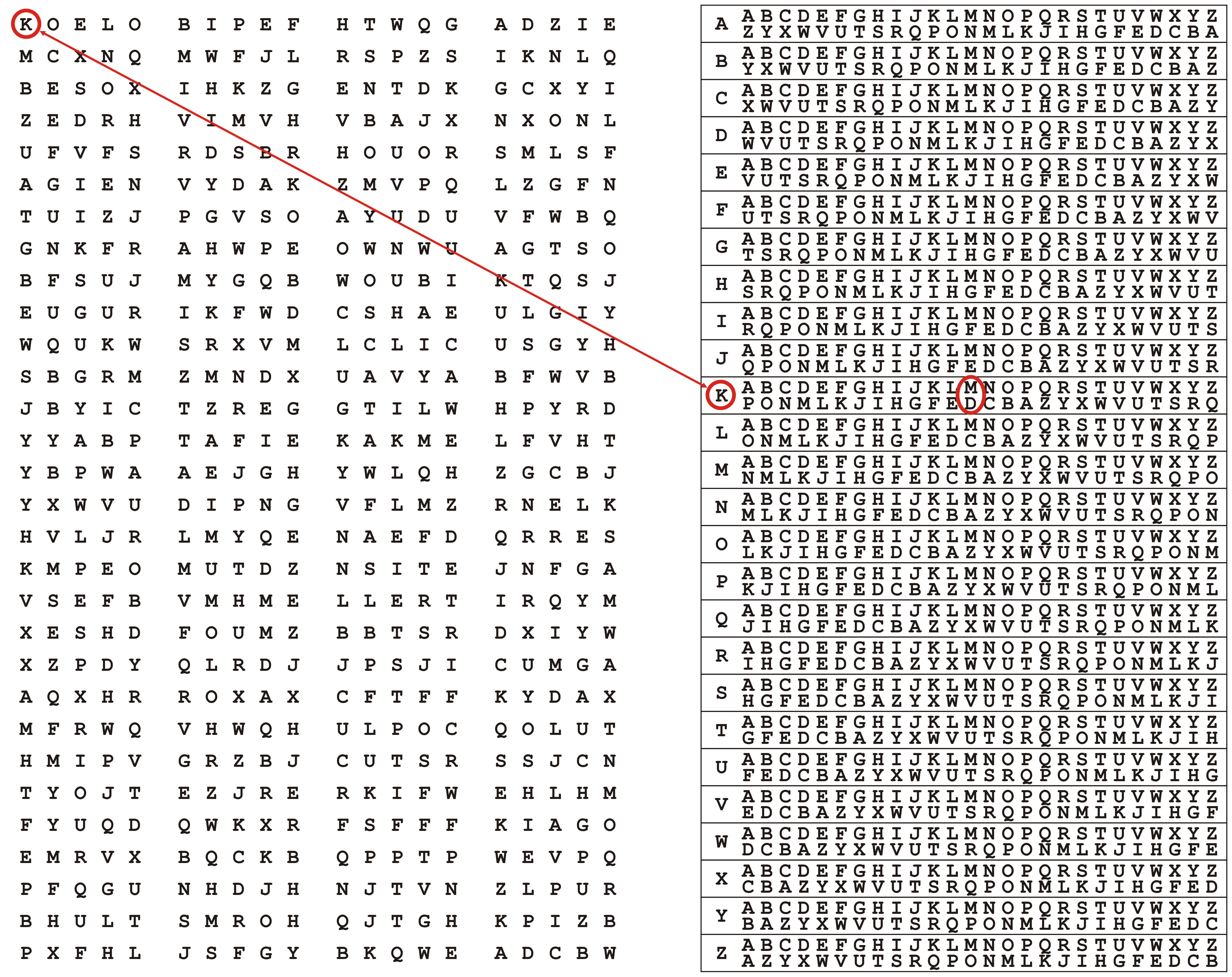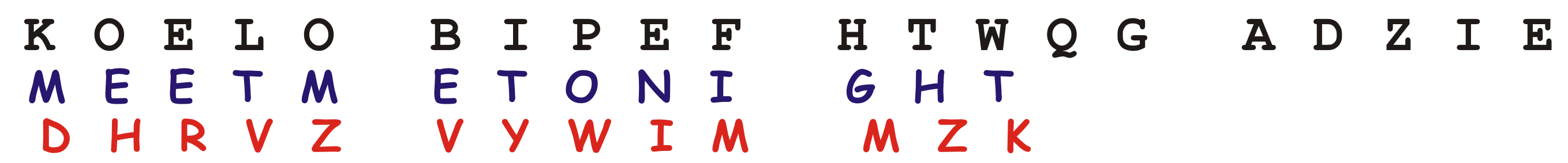 The message itself would be reduced to just capital letters without spaces or punctuation, so our message above would be MEETMETONIGHT. Next, we would start with the first random letter K. This would specify the translation between the plain-text and the cipher-text, so for K, A would be coded as P, B as O, C as N, and so on. In this case, M would be encrypted as D: