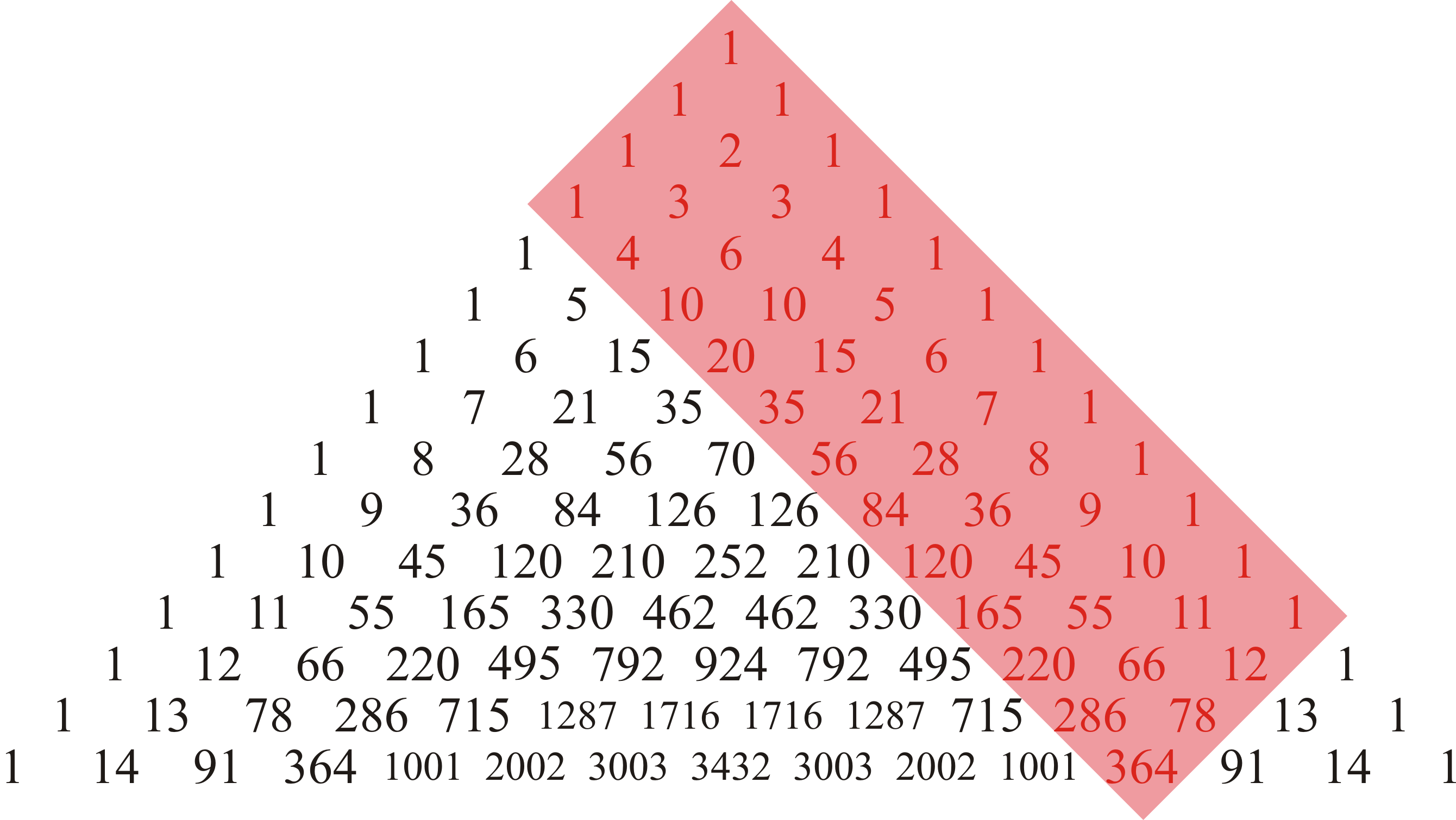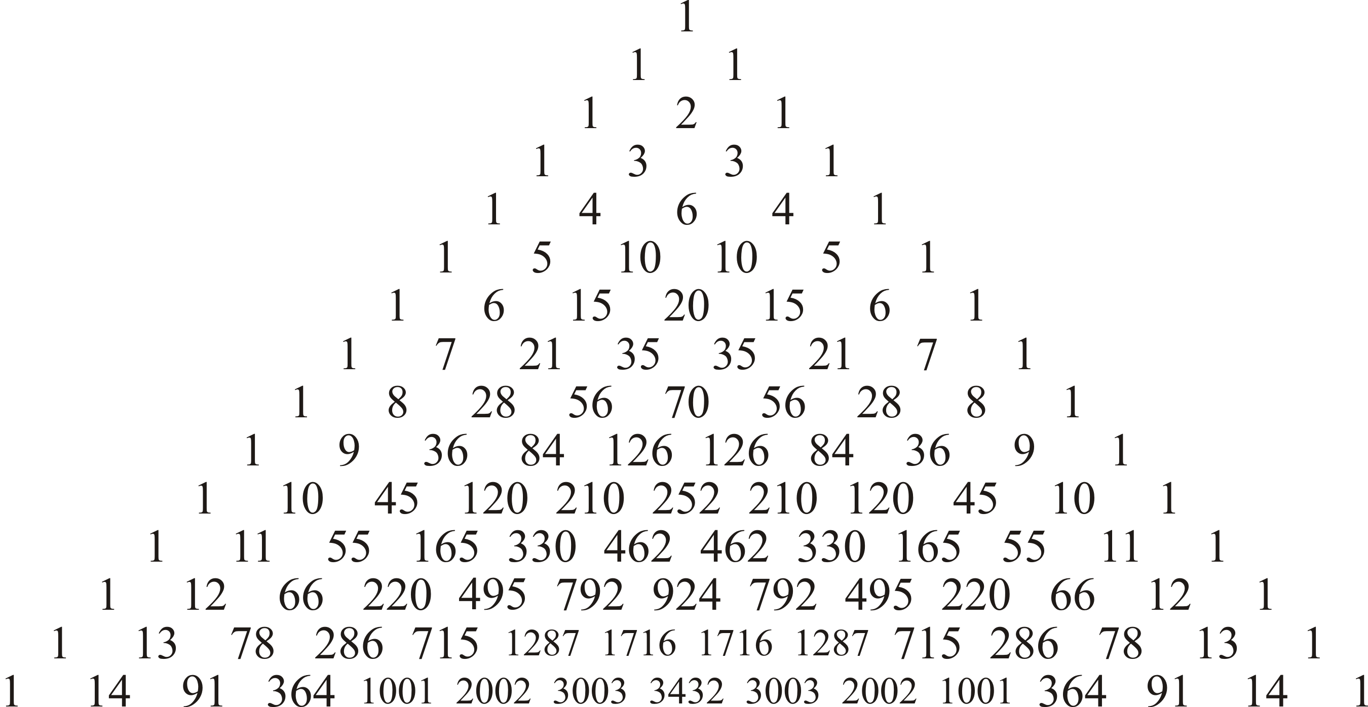 Suppose we are calculating ${14 \choose 5}$; again, in this case, we can calculate the value by starting with the array {1, 1, 1, 1, 1, 1}, and then building from this array the array {1, 2, 3, 4, 5, 6}, and then building from this the array {1, 3, 6, 10, 15, 21}, and repeating this seven more times produces the array {1, 10, 55, 220, 715, 2002}, where ${14 \choose 4} = 2002$. This is shown here: