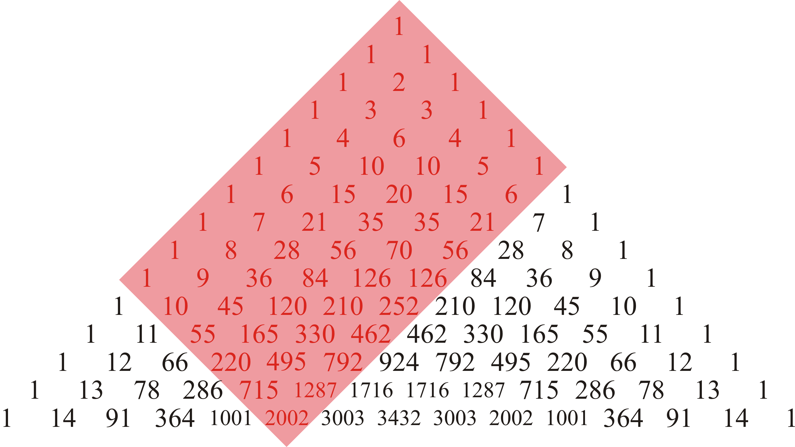 Consider Pascal's triangle up to $n = 14$: