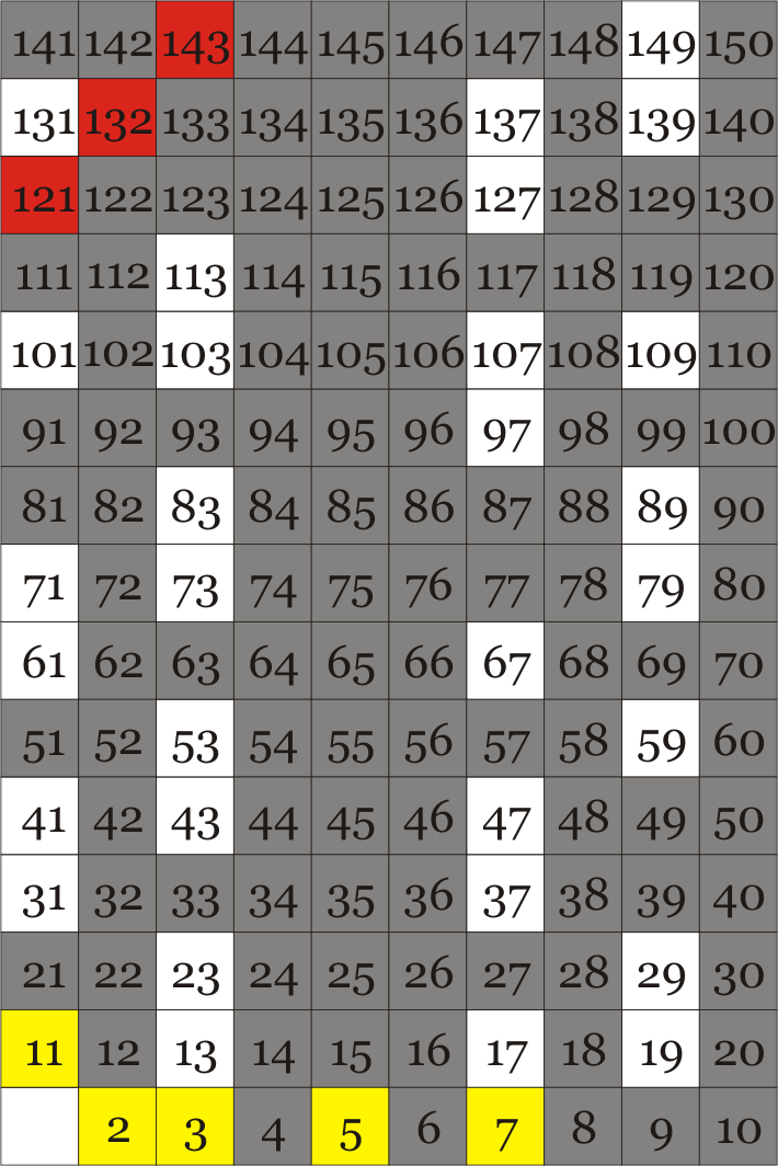 Figure 6. All multiples of $p = 11$ greater than or equal to $11^2 = 121$ are