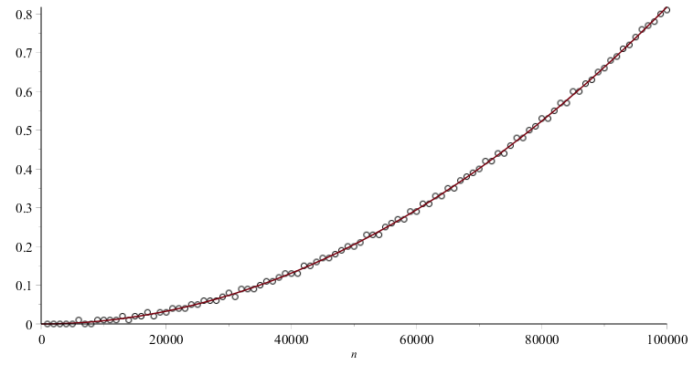 The red line in Figure 1 is the best-fitting least-squares quadratic polynomial $p(n) = 2.8195 \times 10^{-8} n + 8.1437\times 10^{-11} n^2$.