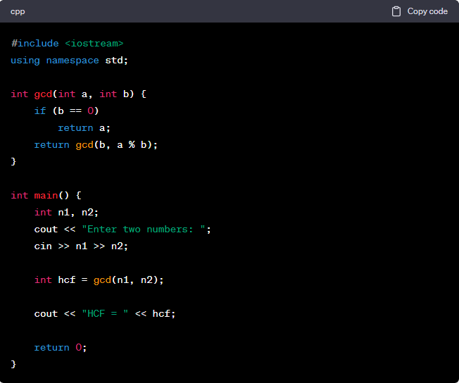 Does this correctly calculate the gcd of two numbers? #includeThe code you've provided attempts to calculate the greatest common divisor (gcd) of two numbers using a loop and the basic definition of gcd. While it will give you the correct result, there's an optimization that can be made to improve the efficiency of the algorithm. The optimization involves using the Euclidean algorithm, which is a more efficient way to calculate the gcd of two numbers. Here's the optimized version of your code using the Euclidean algorithm:using namespace std; int main() { int n1, n2, hcf; cout << "Enter two numbers: "; cin >> n1 >> n2; // swapping variables n1 and n2 if n2 is greater than n1. if ( n2 > n1) { int temp = n2; n2 = n1; n1 = temp; } for (int i = 1; i <= n2; ++i) { if (n1 % i == 0 && n2 % i ==0) { hcf = i; } } cout << "HCF = " << hcf; return 0; }