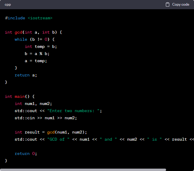 Here is another example: I found some awkward code on the web to calculate the greatest common divisor of two integers, and I asked ChatGPT about them: