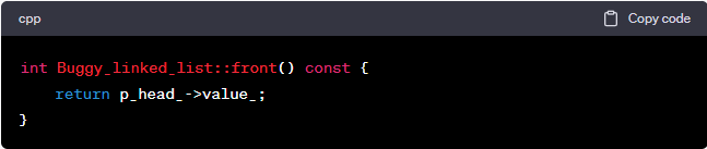 The front() function in the Buggy_linked_list class is missing a return statement. It should return the value of the front node.