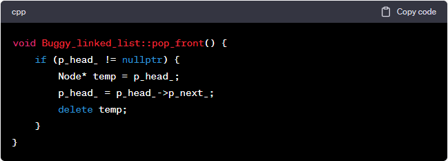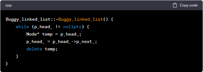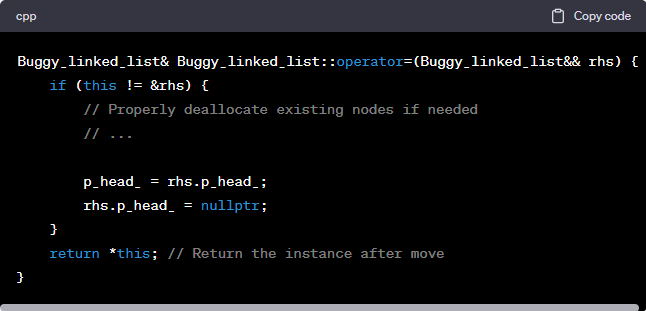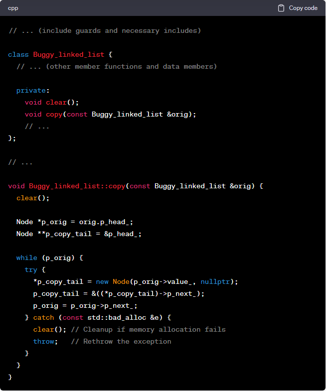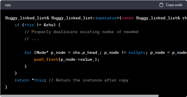 What about the following implementation of a simple linked list in C++? #pragma once #include// Class declarations class Node; class Buggy_linked_list; /////////////////////// // Class definitions // /////////////////////// class Node { public: Node( int value, Node *p_next = nullptr ); int value_; Node *p_next_; }; class Buggy_linked_list { public: Buggy_linked_list(); ~Buggy_linked_list(); Buggy_linked_list( const Buggy_linked_list &orig ); Buggy_linked_list( Buggy_linked_list &&orig ); Buggy_linked_list &operator=( const Buggy_linked_list &rhs ); Buggy_linked_list &operator=( Buggy_linked_list &&rhs ); void push_front( int n ); int front() const; void pop_front(); private: void clear(); void copy( const Buggy_linked_list &orig ); Node *p_head_; }; Node::Node( int value, Node *p_next ): value_{ value }, p_next_{ p_next } { // Empty constructor } Buggy_linked_list::Buggy_linked_list(): p_head_{ nullptr } { // Empty constructor } Buggy_linked_list::~Buggy_linked_list() { clear(); } Buggy_linked_list::Buggy_linked_list( const Buggy_linked_list &orig ): p_head_{ nullptr } { copy( orig ); } Buggy_linked_list::Buggy_linked_list( Buggy_linked_list &&orig ) { p_head_ = orig.p_head_; orig.p_head_ = nullptr; } Buggy_linked_list &Buggy_linked_list::operator=( const Buggy_linked_list &rhs ) { if ( this != &rhs ) { // Properly deallocate existing nodes if needed copy( rhs ); } return *this; } Buggy_linked_list &Buggy_linked_list::operator=( Buggy_linked_list &&rhs ) { if ( this != &rhs ) { // Properly deallocate existing nodes if needed clear(); p_head_ = rhs.p_head_; rhs.p_head_ = nullptr; } return *this; } void Buggy_linked_list::push_front( int n ) { p_head_ = new Node{ n, p_head_ }; } int Buggy_linked_list::front() const { if ( p_head_ == nullptr ) { throw std::runtime_error{ "The linked list is empty." }; } return p_head_->value_; } void Buggy_linked_list::pop_front() { if ( p_head_ != nullptr ) { Node *p_tmp{ p_head_ }; p_head_ = p_head_->p_next_; p_tmp->p_next_ = nullptr; delete p_tmp; p_tmp = nullptr; } } void Buggy_linked_list::clear() { while ( p_head_ != nullptr ) { Node *p_tmp = p_head_; p_head_ = p_head_->p_next_; p_tmp->p_next_ = nullptr; delete p_tmp; p_tmp = nullptr; } } void Buggy_linked_list::copy( const Buggy_linked_list &orig ) { clear(); if ( orig.p_head_ != nullptr ) { p_head_ = new Node{ orig.front(), nullptr }; for ( Node *p_orig{ orig.p_head_->p_next_ }, *p_copy_tail{ p_head_ }; p_orig != nullptr; p_orig = p_orig->p_next_, p_copy_tail = p_copy_tail->p_next_ ) { p_copy_tail->p_next_ = new Node{ p_orig->value_, nullptr }; } } }