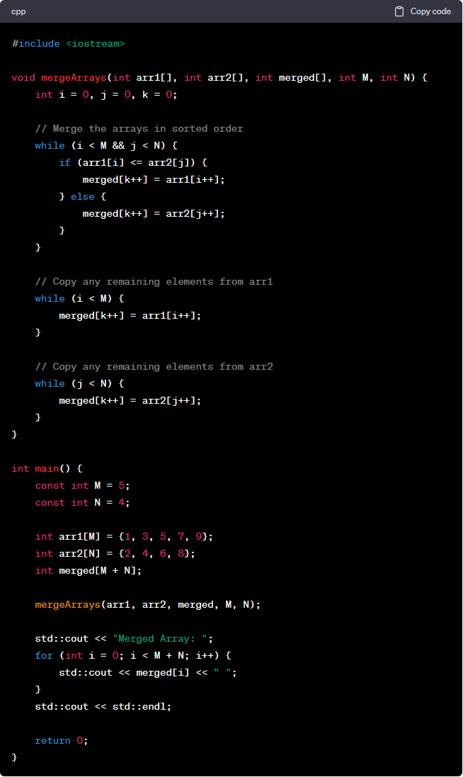 #include// Function declarations int main(); void merge_arrays( int array1[], std::size_t capacity1, int array2[], std::size_t capacity2 int merged[], ); // Function definitions int main() { const int M{5}; const int N{4}; int arr1[M]{1, 3, 5, 7, 9}; int arr2[N]{2, 4, 6, 8}; int merged[M + N]; merge_arrays( arr1, M, arr2, N, merged ); std::cout << "Merged Array: "; for (int i = 0; i < M + N; i++) { std::cout << merged[i] << " "; } std::cout << std::endl; return 0; } void merge_arrays( int array1[], std::size_t capacity1, int array2[], std::size_t capacity2 int merged[], ) { // Set each index to the first entry // of each of the three arrays std::size_t idx1{ 0 }; std::size_t idx2{ 0 }; std::size_t m{ 0 }; // Merge the arrays in sorted order while ( (idx1 < capacity1) && (idx2 < capacity2) ) { if ( array1[idx1] <= array2[idx2] ) { merged[m] = array1[idx1]; ++m; ++idx1; } else { merged[m] = array2[idx2]; ++m; ++idx2; } } // Copy any remaining elements from 'array1' while ( idx1 < capacity1 ) { merged[m] = array1[idx1]; ++m; ++idx1; } // Copy any remaining elements from 'array2' while ( idx2 < capacity2 ) { merged[m] = array2[idx2]; ++m; ++idx2; } }