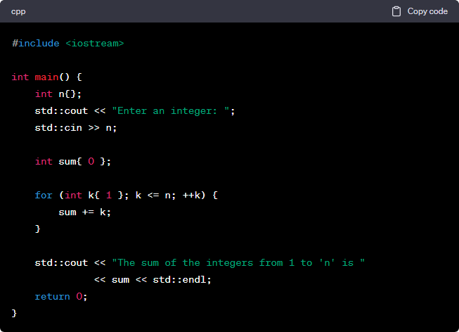 Why does the following code not correctly calculate the sum of the integers from 1 to n? #includeint main(); int main() { int n{}; std::cout << "Enter an integer: "; std::cin >> n; int sum{ 0 }; for ( int k{ 0 }; k < n; ++k ) { sum += k; } std::cout << "The sum of the integers from 1 to 'n' is " << sum << std::endl; return 0; }