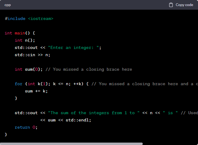 Why does this code not compile? #include> n; int sum{ 0 ; for (int k{ 1 }; k <= n; ++k { sum += k; } std::cout << "The sum of the integers from 1 to "n" is " << sum << std:endl; return 0; }